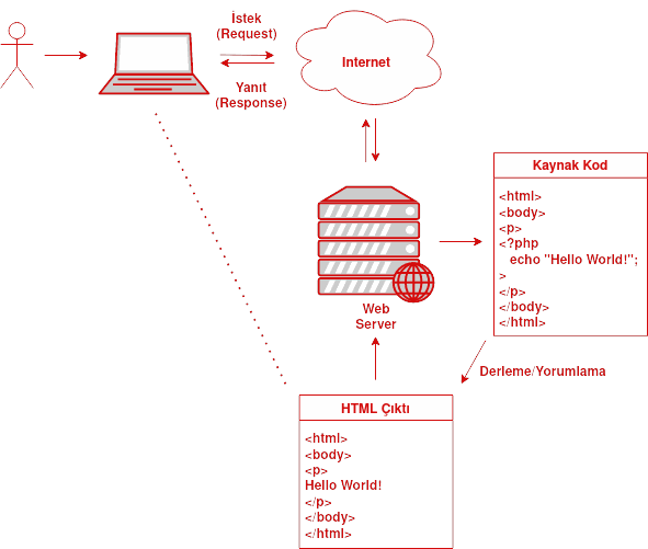 Dikkat! Bu kısım JavaScript gibi Client-Side bir dil için değil; PHP, Java gibi Server-Side diller için geçerlidir. Bir HTML dosyasının içerisinde JavaScript diline ait kodlar bulunabilir. Ancak bu kodlar HTML dosyasının kendisi tarafından değil, browser tarafından çalıştırılır. Bu yüzden HTML dosyası bir Statik dosyadır.